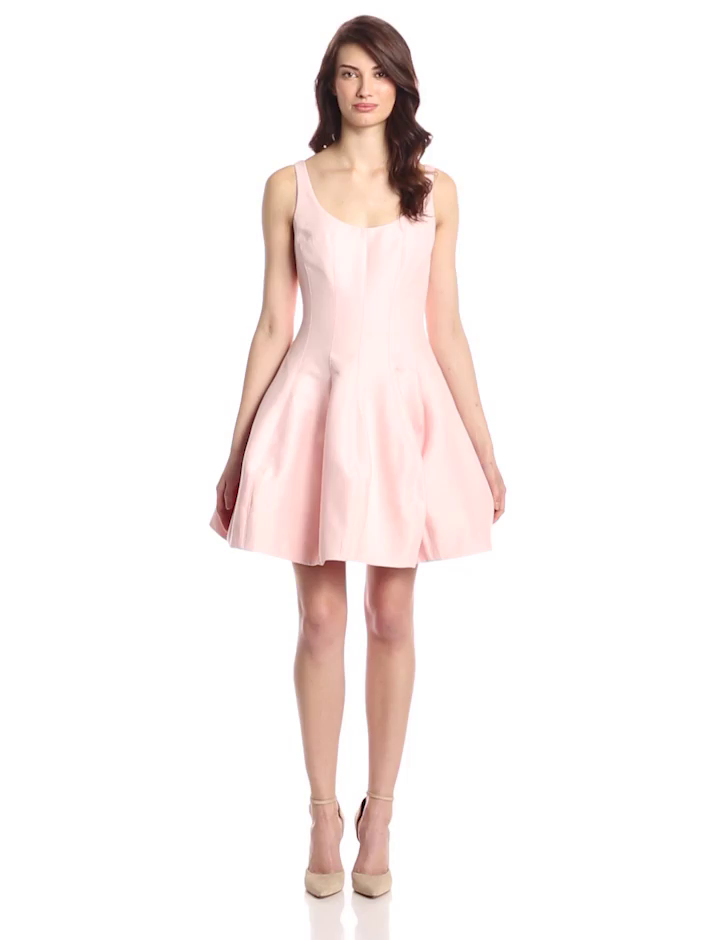 Sleeveless fit-and-flare dress featuring scoop neckline and back, princess-seamed bodice, and structured voluminous skirt