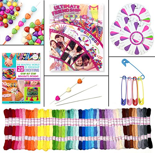 COLORFUL FRIENDSHIP BRACELET PACK INLCUDING - 50 regular embroidery floss skeins - 100% Cotton and Mercerized, 50 round beads, 50 heart beads, 5 safety pins, 3 beads needles, 3 friendship wheels -The Best Birthday Gifts/Christmas Present/Girls Toys and DIY Crafts For Kids!