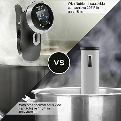- FASTER COOKING TIME: An average sousvide immersion circulator can achieve 140F in only 30 minutes. In half the time the sous vide 120V cooker achieves 203F in only 15 mins.