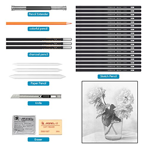 - [PACKAGE INCLUDED]:18 piece of sketch pencils+Three of chrocoal pencils+Premium colorful sharpened Pencils that are produced with carefully selected high-quality pigments+ Two of eraser,when you feel so hard to clean when use the charcoal pencil to drawing and sketching ,the black eraser help you to erase it complitely+ Durable Break-resistant knife.+ Stylish, lightweight canvas roll.+ metal double-end pencil extender,when your pencil is short,set in the pencil extension,can increase the length.