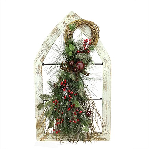 Gerson Washed Window Frame with Mixed Pine & Berry Swag Christmas Wall Decoration, 29.5", White