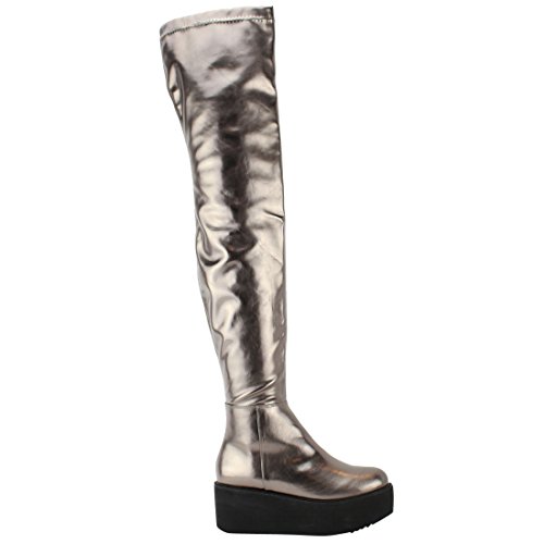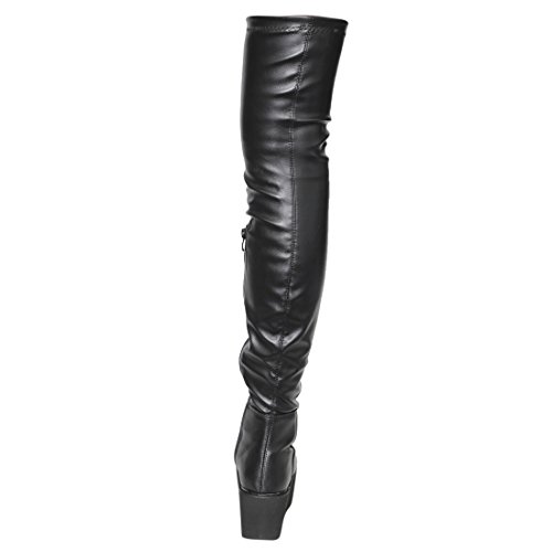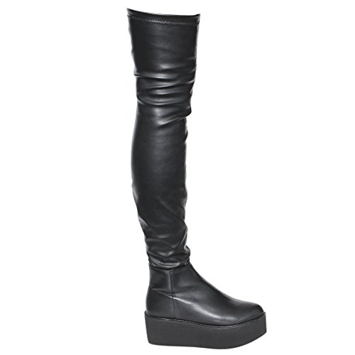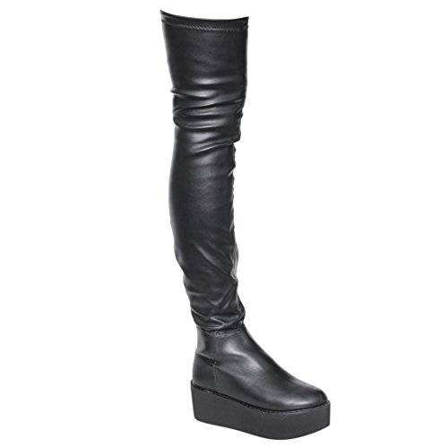 Product Description Take your look to exotic places in these thigh high boots!Design with a pull on elasticated fastening,flatform silhouette,vegan upper,stretchy snug fit lugged manmade outsole and smooth lining. 0