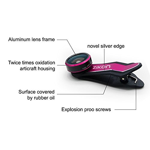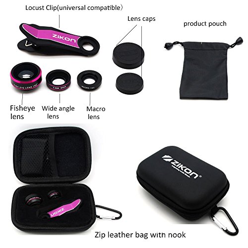 ZiKON 3 in 1 Cell Phone Camera Lens Bundle with 198 Degree Fisheye Lens, 15X Macro Lens, 0.63X Wide Angle Lens and Accessories for Smart Phones - Hot Pink