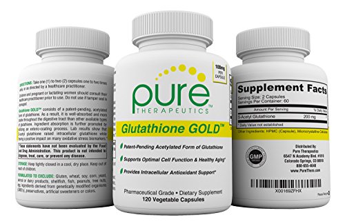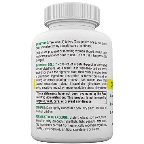 -. Feature : EACH CAPSULE Contains 100mg of S-Acetyl-Glutathione perfect for "split dosing" - 60 caps is a 1 to 2 month supply. Use of enteric coating further protects stability. Manufactured in the USA in a GMP-certified facility, for guaranteed quality and potency. / GLUTATHIONE GOLD is a patented S Acetyl Glutathione from a top European Biotech. Studied head to head against IV glutathione with very similar results. Provides Intracellular Antioxidant Support. BUYER BEWARE - don't be fooled by the "cheaper" s-acetly-glutathione products out there even if they are pharmaceutical grade, they are very likely sourcing their raw materials from China! / WHAT'S NOT THERE IS ALMOST AS IMPORTANT AS WHAT IS: We formulated our product with your needs in mind, that's why it is non-GMO, soy and gluten free, and unlike other brands does not contain the additive magnesium stearate which is thought to potentially inhibit absorption of key nutrients. / SUPPORTS Healthy Cell Function, Healthy Aging, Detoxification & a Healthy Immune Response. Supports Amino Acid Transport Across Cell Membranes. / ENHANCES