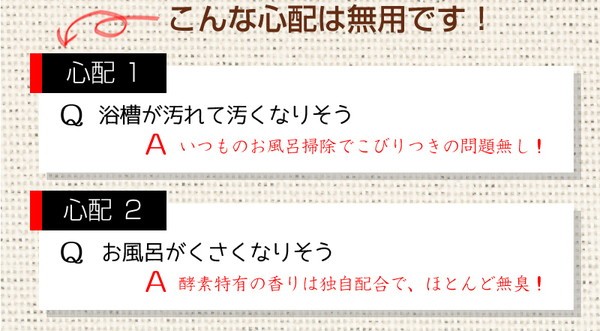 浴槽のお湯(約200L)に対して20~25g程度入れ、よくかき混ぜてからご入浴ください。 |