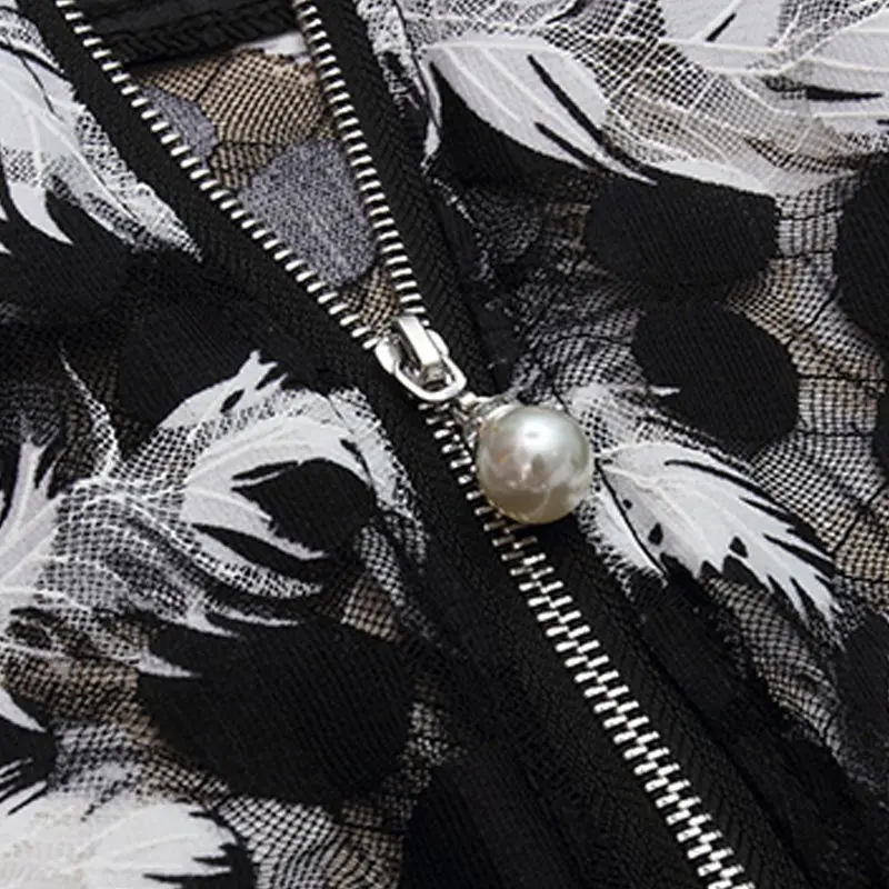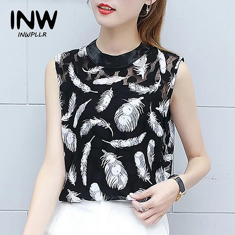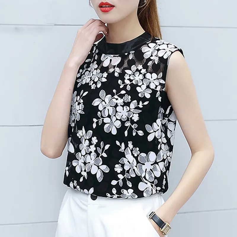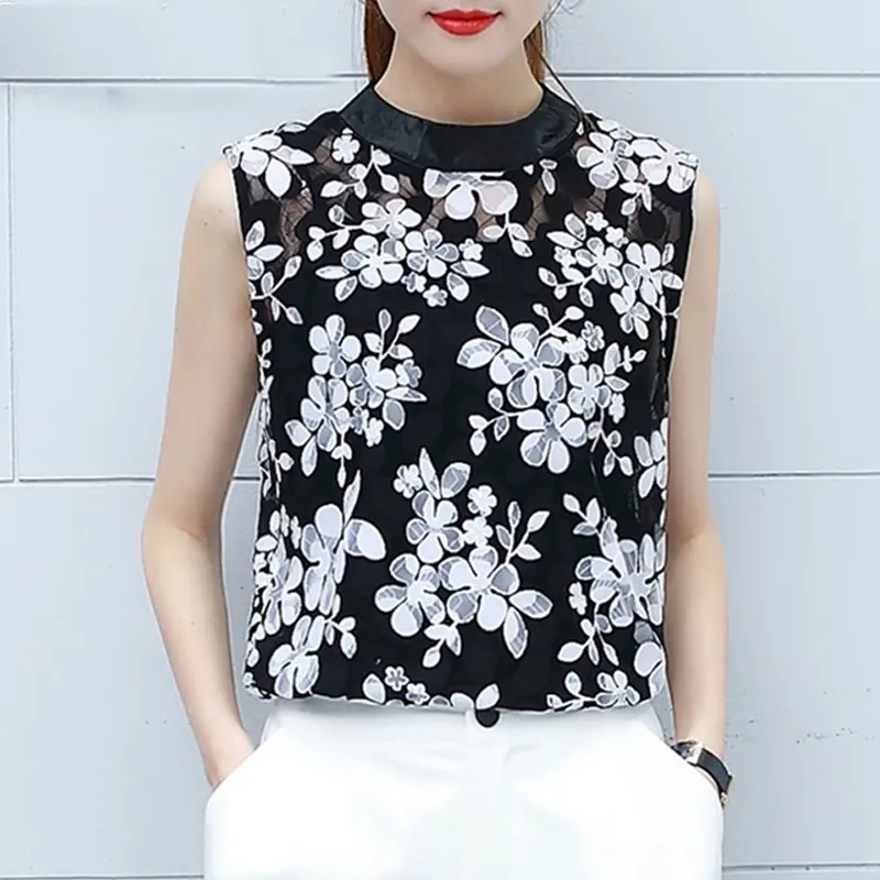Blusa Feminina: Black Lace Blouses Tops Women's Sleeveless Beading Zipper Blouse Mujer