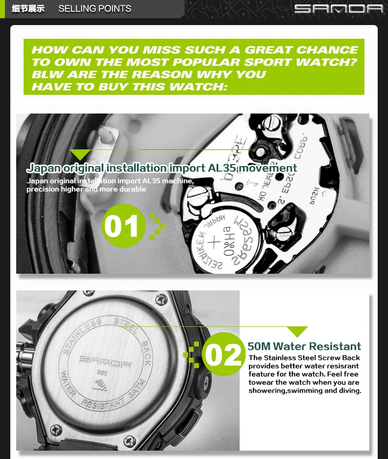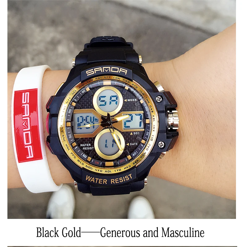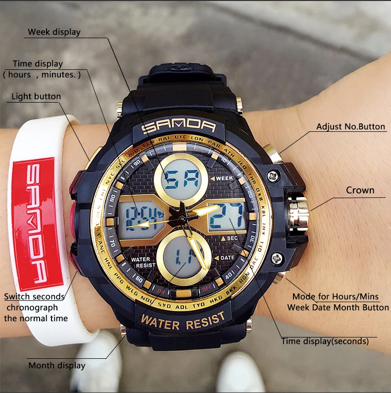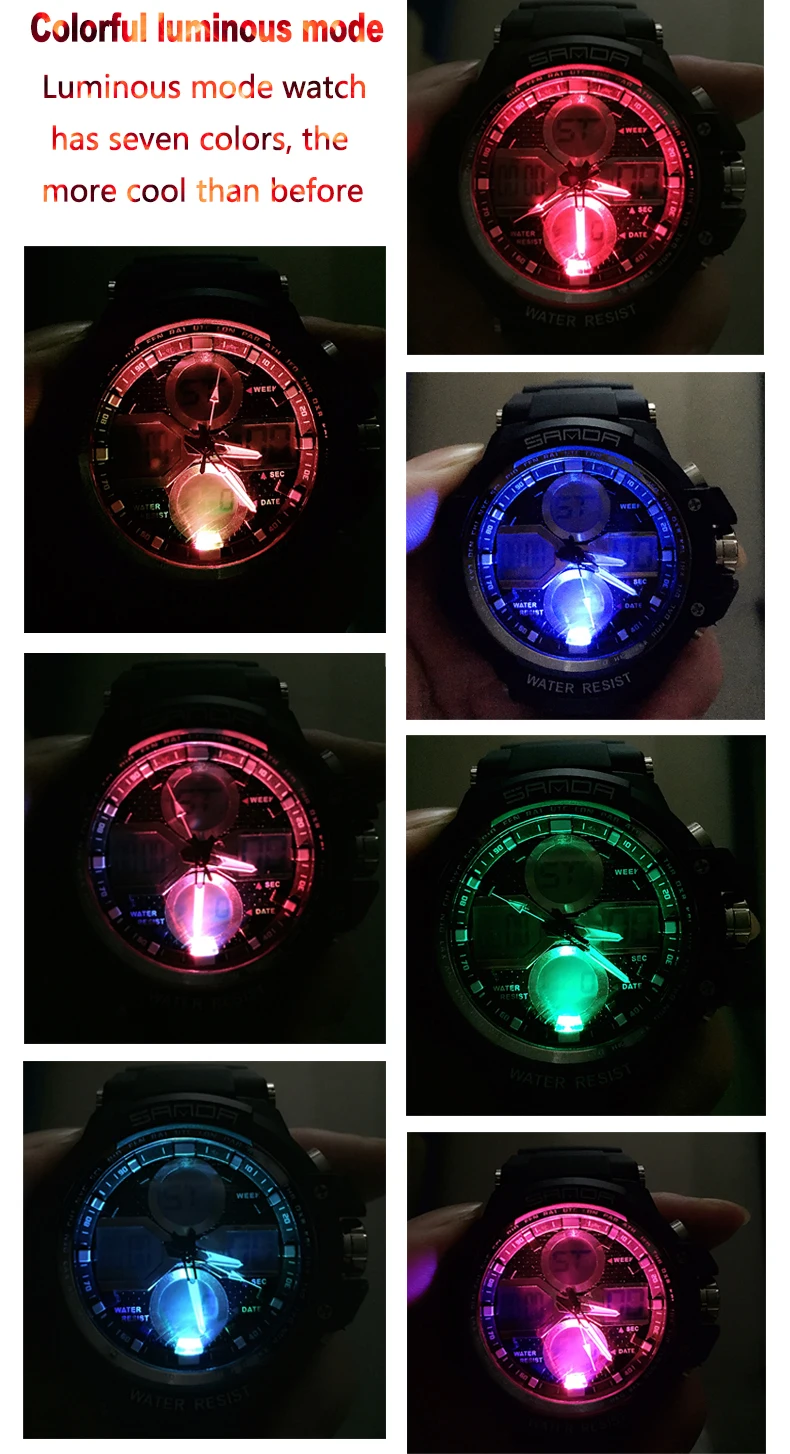 Feature:Water Resistant,LED display,Luminous,Stop Watch,Back Light,Shock Resistant,Chronograph,Auto Date,Alarm,Swim