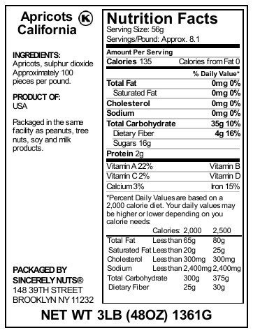 KOSHER CERTIFIED: Sincerely Nuts chooses only the finest apricots from Turkey, assuring you of utterly supreme quality.