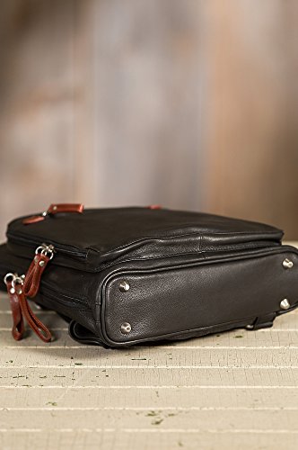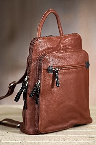 -. Feature : Soft cashmere Argentine leather is just one of many features of this premium 2-tone leather backpack / Front zip pocket. Accordion-style front compartment, inside RFID zip pocket / 8 card slots, wide slip pocket, wide zip pocket, 2 small pouches, and 2 pen holders. Nylon lining / The main compartment is divided by an 8" x 8" center zip pouch; includes several pockets / Closes with 2 way zippers. Rolled leather handle. Adjustable leather straps. 10.5" x 12" x 4"