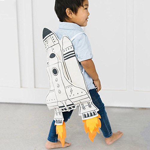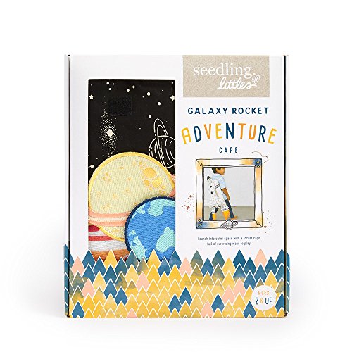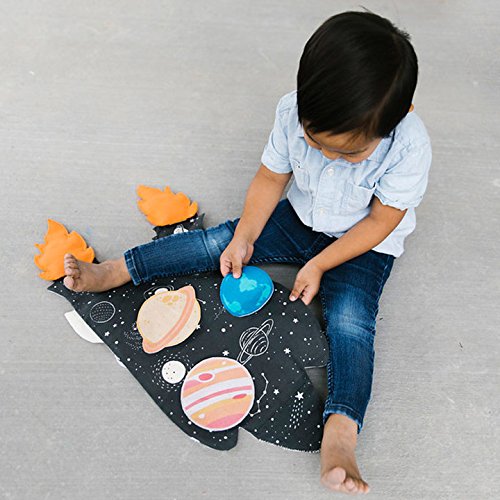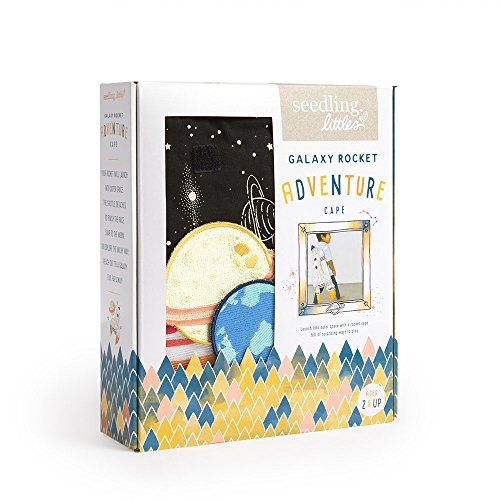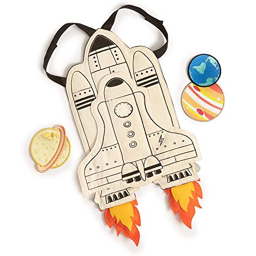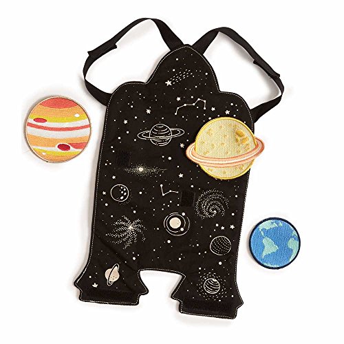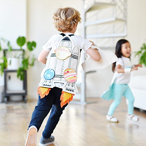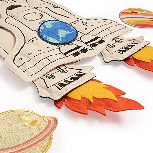 Soft cotton space shuttle cape features elastic straps made just for little arms. Easy-to-attach planet patches, orbiter shuttle, and felt rocket flames make customizing the cape simple and fun for a new play experience every time!