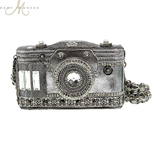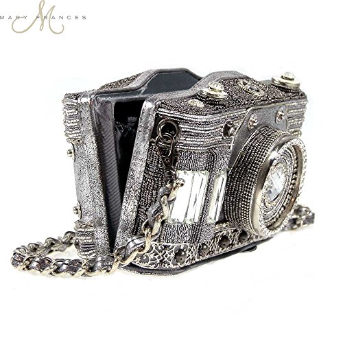 -. Brand : Mary Frances -. Color : Silver -. Department : womens -. EAN : 0634010159399 -. Feature : Handmade silver camera shaped novelty handbag / Stunning bead and crystal-like embellishments / Comes with a woven cross-body chain strap, dust cover and certificate of authenticity -. Model : BAG 15-939 -. ProductGroup : Shoes -. ProductTypeName : HANDBAG -. Title : Mary Frances Full Exposure Handbag Handbag -. UPC : 634010159399 You will be one step ahead of the paparazzi when you walk out wearing Mary Francesâ€TM ‘Full Exposureâ€TM whimsical camera handbag. A new look to this classic Mary Frances design, ‘Full Exposureâ€TM is perfect for a quiet rendezvous, night time clubbing, or daytime outing. Antiqued silver accented with metal filigree, studs, rhinestones, and beads, ‘Full Exposureâ€TM is a standout addition to your handbag collection.