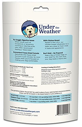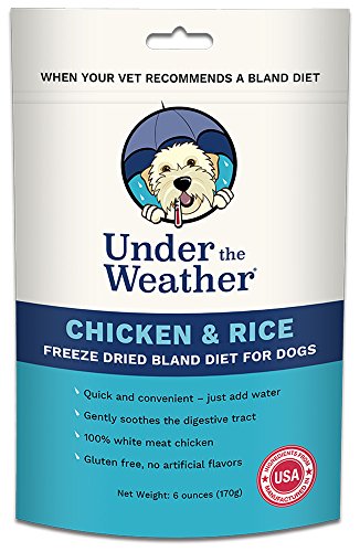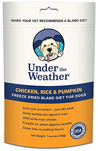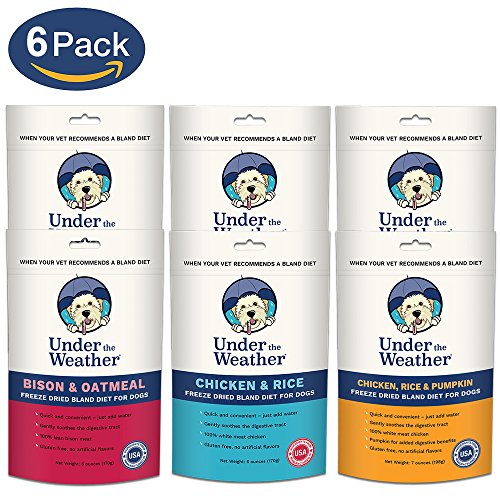 -. Feature : BLAND DIET DOG FOOD: Easy to serve when a bland diet is necessary to soothe your dog's digestive tract during times of upset, such as vomiting or diarrhea. / CHOOSE FROM THREE GENTLE RECIPES: Under the Weather freeze dried dog food is available in three soothing recipes: Chicken and Rice, Chicken and Rice with Pumpkin, and Bison and Oatmeal / QUICK AND CONVENIENT: Make a bland diet dog food meal in minutes. Simply add water to rehydrate the freeze-dried formula. / MADE IN THE USA: Under the Weather freeze dried dog food is made in the USA from gluten-free human-grade ingredients sourced in the USA