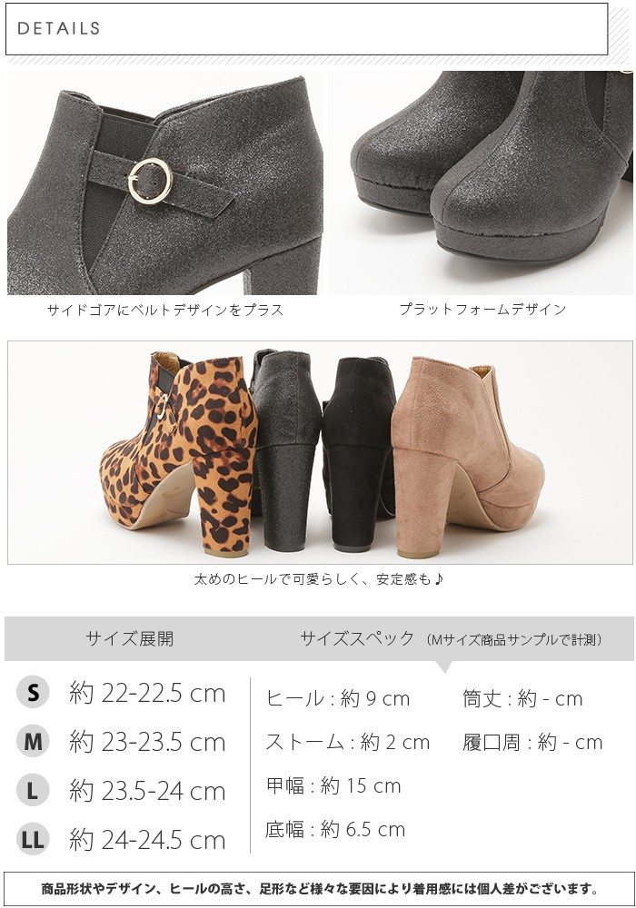 | カラー | 01. ブラックスムース 02. ベージュスエード 03. レオパード 04. ブラックグリッター |
