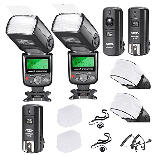 - Feature : Powerful Flash with High Guide No. 58 (m) / 190ft(at 105mm focal length,ISO 100 in meters/feet). Lens Coverage 14mm - 180mm. / Wireless Flash trigger with Remote Shutter Function will trigger off-camera flash units and studio lights from up to 30meters / 100 feet away. / Charging socket for external power pack: adds a charging socket for external power pack. PC synchronous port: simple for you to use the PC synchronous line. / Kit includes:2 Neewer VK750II Pro I-TTL Auto-Focus Flashes + 2.4GHz 3-in-1 wireless remote control for camera, speedlite and studio flash (1 Transmitter, 2 Receivers) + 2 Cables(N1-Cord +N3-Cord Cables)for Remote Control + 2 Hard Flash Dfiffusers + 2 Soft Flash Diffusers + 2 Lens Cap Holders / Backed with Neewer 1-Year 100% Satisfaction Guarantee.