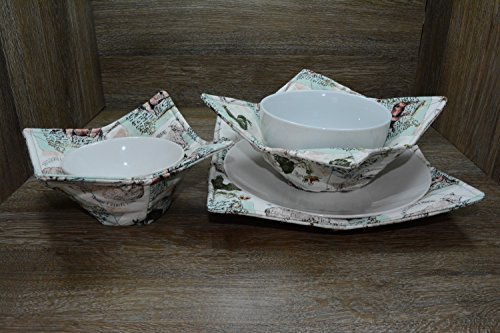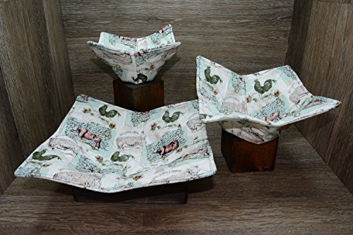 Product Description Microwave cozy set includes 1 small bowl cozy (Approx 6.5" sq), 1 medium bowl cozy (Approx 8" sq), 1 dinner plate cozy (Approx 10" sq.) The dinner plate cozy can also be used for round casserole dishes and the small size is great for coffee mugs! These microwave cozies are the perfect solution to handling super-hot dishes. Cooking and reheating food in a dish cozy makes life so much easier! Place your microwaveable dish inside the bowl cozy and put the whole thing in the microwave to heat. To take the bowl out, you simply grab the corners of the cozy. We found that our kids can now get their dishes out of the microwave safely. Cozies will also protect your fingers from the cold when holding a bowl of ice cream and are great for protecting your table. You can also use a cozy placed on top the dish you are microwaving to help steam food. MATERIALS: * 100% cotton fabric * 2 layers of 100% cotton batting * 100% cotton thread Please be advised: Bowl cozies must only be used in microwaves with a rotating base. To avoid scorching or burning, please make sure cozy freely rotates in your microwave. Never leave microwave unattended. Make sure cozy is clean with no pieces of food attached. Do not microwave cozy for more than three minutes. Cozies can be machine washed on delicate cycle. Reshape and allow to air dry for best results. Please let us know if this is a gift, and we will ship without a packing slip enclosed! #bowlcozy #microwaveable #handmadeatamazon #hot4handmade #buyhandmade 0
