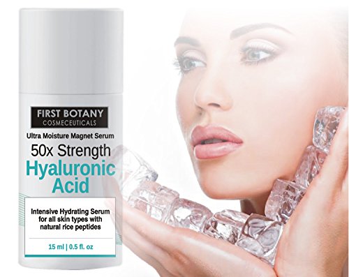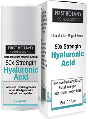 50X STRENGTH HYALURONIC Serum for Skin - The Ultra Moisture Magnet Serum by FIRST BOTANY cosmeceuticals has 50 times the water binding capacity of high molecular weight hyaluronic acid (HMWHA). It is a very powerful free radical scavenger than regular hyaluronic acid products. It provides 5 times more moisturization than regular hyaluronic acid after 24 hour. ... One of the best Hyaluronic Acid products in the market