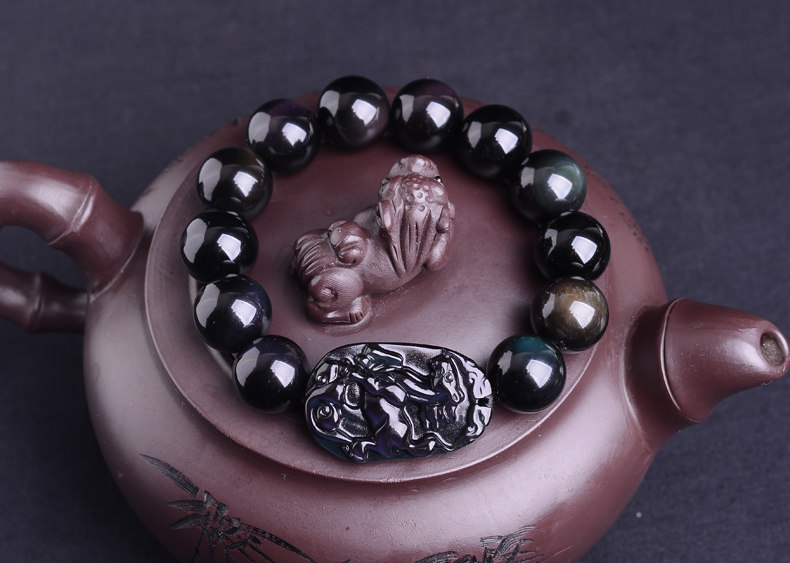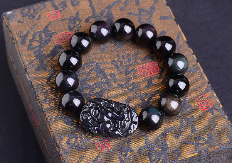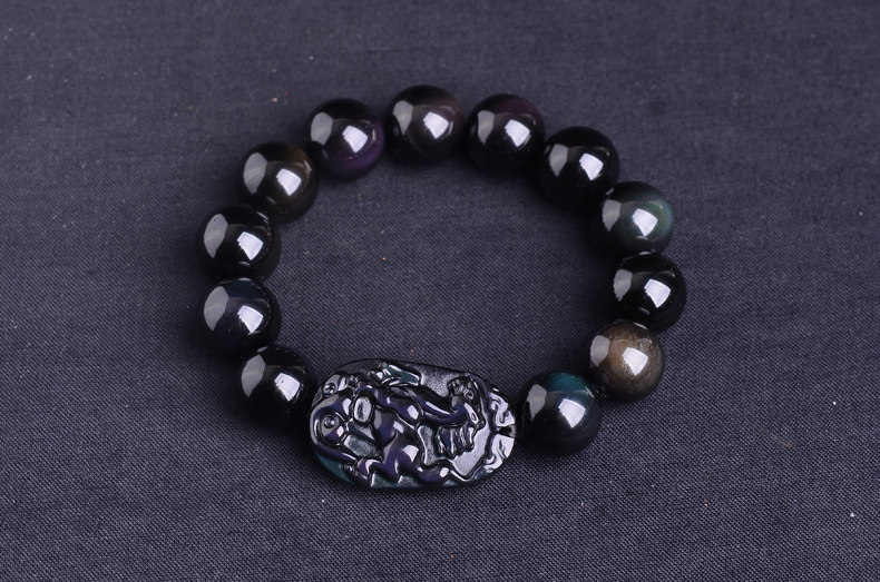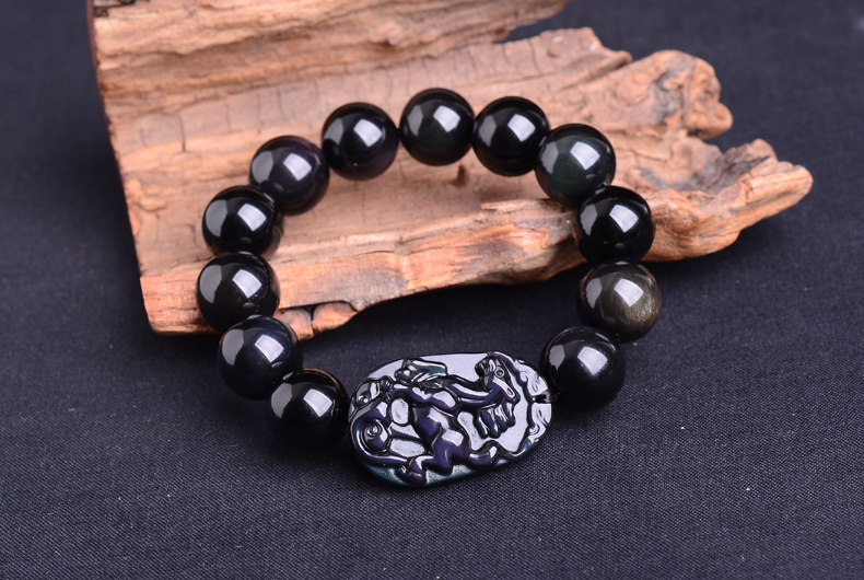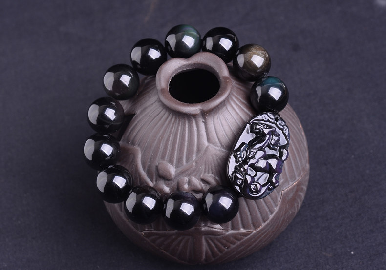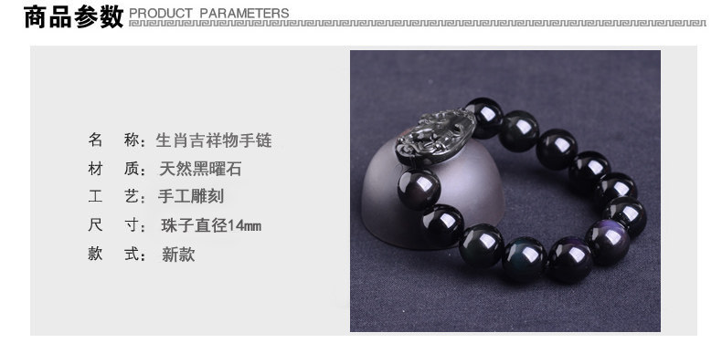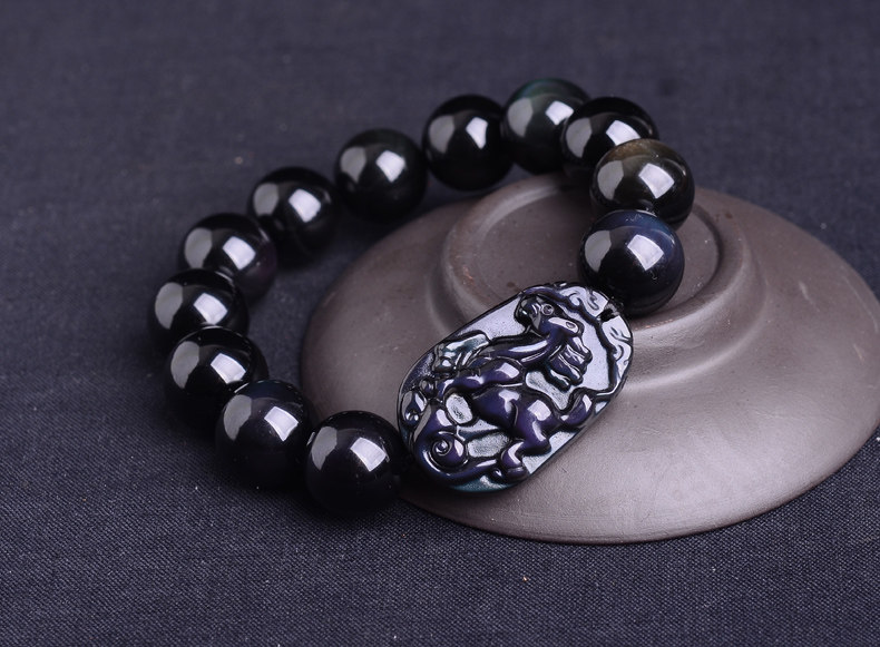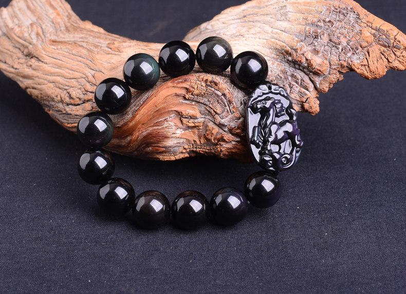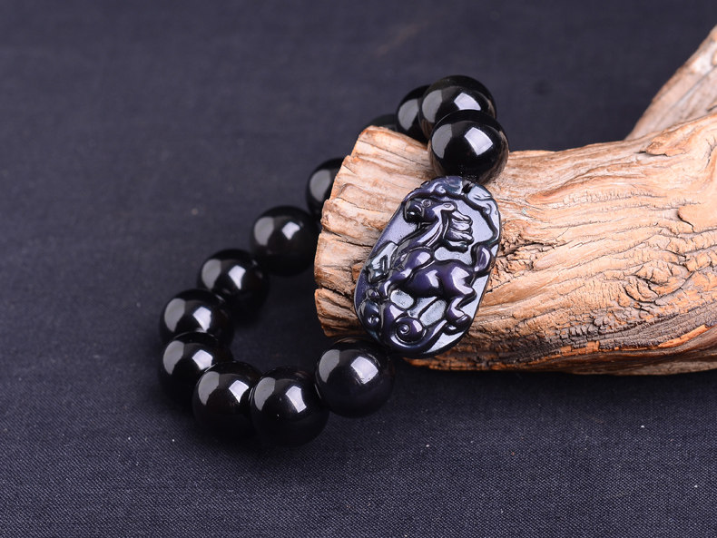 生肖马吉祥物手链 男款佛珠天然黑曜石男士手串