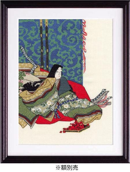 | 尾形光琳(おがたこうりん)筆18世紀。「源氏物語」を題材に描かれた。大ぶりの唐草文様の凡帳を背に、十二単の中宮と花紅葉をあしらった箱蓋を描き、王朝の雅やかな遊びがしのばれる。技法は、すべてクロスステッチを使用しています。技術レベルは、中級~上級者向です。 |