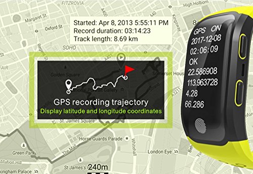 -. Feature : 【Advanced Configuration】Perfectly compatible both iOS and Android smartphone. 0.96 inch OLED large screen, with skin-friendly TPU band, which makes it more upscale and comfortable wearing. 240x240 resolution, Real 230 mAh high power polymer battery, stand by >15 days, normal use >3 days, GPS use >6 hours. / 【GPS & Laps Record the Fitness Track】GPS Function: It can dispay the longitude and latitude coordinates, world time / date, altitude, speed of movement. Laps Record: set the lap length, 2 modes: manual/automatic. / 【IP68 Water Resistance】Sweatproof, IP68 waterproof and dust proof, no fear of daily water. Overall waterproof IP68 helps you stay active, motivated, and connected wherever. / 【Information Sync Display】Support APP for Apple iOS and Android smartphone. With the APP connected, the SMS and notifications on the smart phones will be synced to the watch, and you could use the watch read the message and the notifications(Twitter, Facebook, Whatsapp SNS Infos) on the watch directly. / 【Main Functions】Sport mode (Swimming, Walk, Run, Climb, Ride), GPS information, Record Laps, Pedometer, Calorie consumption, Heart rate monitoring, Sedentary reminder, Sleep monitoring, Alarm clock, Call/SMS reminder, Time/Date Sync display and etc.