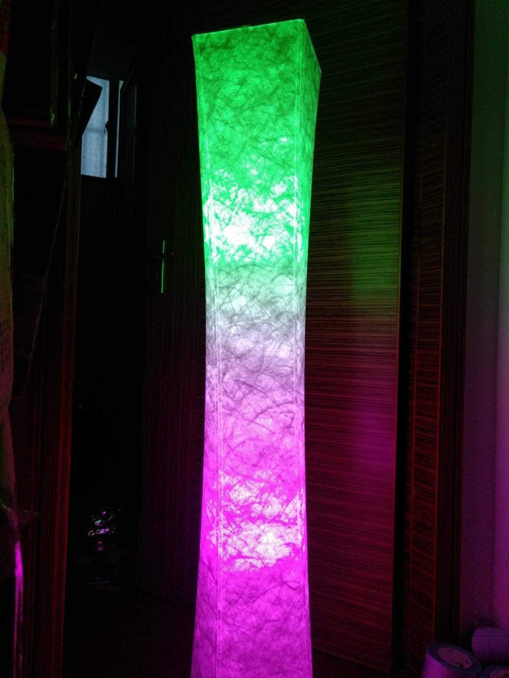 The tall light illuminates the dark corner and the warm overall tone of the whole space