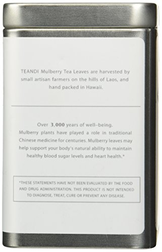-. Binding : Misc. -. Brand : TEANDI -. EAN : 0696859276200 -. Feature : All natural, dried white mulberry (Morus Alba) leaves, herbal tea supplement, caffeine free (approximately 23 servings per container) / Supports your body's natural ability to maintain healthy blood sugar levels and heart health / Pesticide free / Grown by artisan farmers and then packed in Hawaii / Stored in premium tea tin, that helps keep leaves fresher longer compared to being stored in plastic pouches -. LegalDisclaimer : *These statements have not been evaluated by the Food and Drug Administration, this product is not intended to diagnose, treat, cure or prevent any disease. Consult your health professional before use if you are pregnant or nursing, diabetic, or have any other medical condition. -. ProductGroup : Grocery -. ProductTypeName : GROCERY -. Size : 1 Ounce -. Title : White Mulberry Tea (Morus Alba) by TEANDI. Premium, All Natural, Pesticide Free. Loose Leaf, 1 Ounce, 28g (about 23 servings) -. UPC : 696859276200