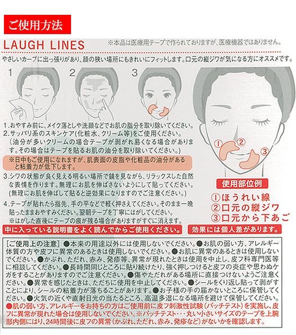 | 普段の表情のクセが少しずつ刻まれてできるのが「表情じわ」。しわ伸ばしテープは、ほどよく堅い医療用テープで皮膚を固定して、寝ている間に、しっかりと気になる「表情じわ」を伸ばしてくれます。寝る前にシワが気になる部分に貼るだけなので、毎日続けられる簡単ケア!!ラフラインは、やさしいカーブに出っ張りがあり、顔の狭い場所にもきれいにフィットします。口元の縦ジワが気になる方にオススメ☆ |