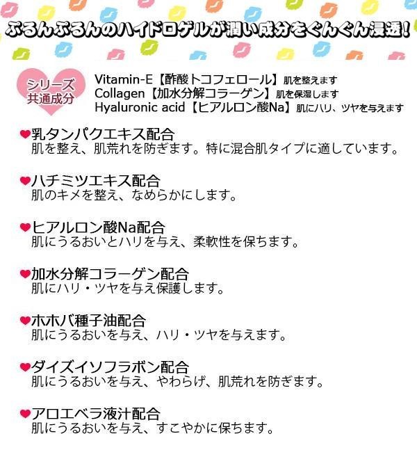| 成分 | 水、グリセリン、BG、ローカストビーンガム、キサンタンガム、アラントイン、乳酸Ca、メチルパラベン、カラギーナン、加水分解コラーゲン、ヒアルロン酸Na、β-グルカン、オオウキモタンパク、カバエキス、ヒマシ油、PEG-60水添ヒマシ油、フェノキシエタノール、ポリグルタミン酸、ホホバ種子油、ナイアシンアミド/パントテン酸Ca/アスコルビルリン酸Na/酢酸トコフェロール/ピリドキシンHCl/マルトデキストリン/シリカ/オクテニルコハク酸デンプンNa、香料、EDTA-2Na、チャ葉エキス、乳タンパクエキス、ダイズイソフラボン、アロエベラ液汁、ハチミツエキス |