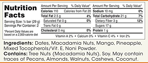 12 Bars Per Box Pack of 12, 2oz bars of Wai Lana Fruit Nut Bars Simple Ingredients Dates, Macadamia Nuts, Mango, Pineapple, Mixed Tocopherols/Vit. E, Noni Powder.