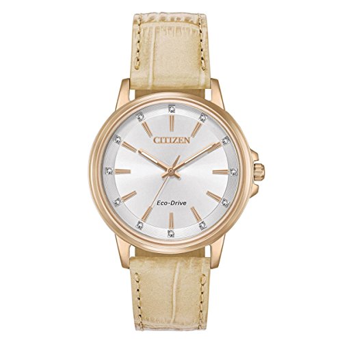 A trendsetter with a touch of sparkle. The Citizen Chandler is clean and casual with a focus on everyday wear. Highlighted with Swarovski crystal indices and powered by light with Eco-Drive technology, not just a solar watch, this model features a ladies' rose gold-tone stainless steel case, taupe leather strap and brilliant silver dial.Feature