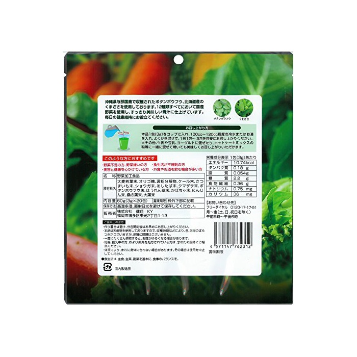 원재료:보리 새잎말,올리고당,전분 분해물,K《루》,고구마,하 # 것이지만,아스하(명일엽),곰 더《사》,장수초,시금치,호박,(당근)인삼,뽕나무의잎,오오바
