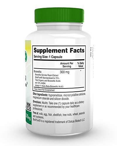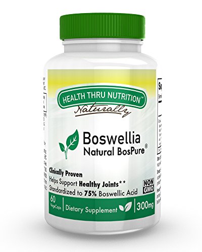 -. Binding : Health and Beauty -. Brand : Health Thru Nutrition -. EAN : 0014654994059 -. Feature : Highest content of Boswellic Acids 75% and 10% AKBA Acetyl-11-Keto-Boswellic Acid / Clinically Proven to Support Healthy Joints / Non GMO / Most effective when combined with our Curcu-Gel Ultra 650mg BCM-95 High Absorption Curcumin Complex / Manufactured under strict cGMP standards in USA -. IsAdultProduct : 0 -. Label : Health Thru Nutrition -. LegalDisclaimer : The information on this label has not been evaluated by the food and administration. This product is not intended to diagnose, treat, cure, or prevent any disease. -. Manufacturer : Health Thru Nutrition -. MPN : 11726-60 -. PackageQuantity : 1 -. PartNumber : 11726-60 -. ProductGroup : Health and Beauty -. ProductTypeName : HEALTH_PERSONAL_CARE -. Publisher : Health Thru Nutrition -. Studio : Health Thru Nutrition -. Title : Boswellia BosPure® 75% Boswellic Acids (10% AKBA - High Potency), NON GMO 300mg 60 Vege-Capsules -. UPC : 014654994059