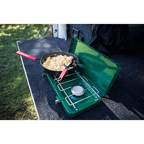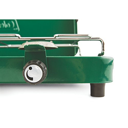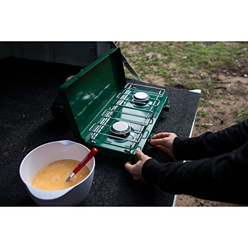Take camp cooking to the next level with the Coleman Triton Propane Stove. Just light it up and dial in your heat with the two independently adjustable burners and you can be cooking over 22,000 BTUs of power in no time. The cooking surface offers plenty of room to fit a 12-in. and 10-in. pan simultaneously. Meanwhile, the PerfectFlow pressure control technology keeps the heat steady, even in extreme conditions. WindBlock panels help shield your flame from wind, and they adjust if you need to fit a larger pan. When the meal is over, the chrome-plated grate removes for simple and quick cleanup, and the heavy-duty latch will keep the lid secure until you whip up your next family dinner.Feature