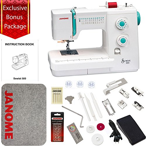 -. Feature : 25 stretch and utility stitches / Easy snap-on presser feet / Automatic 1-step buttonhole / Built-in needle threader / 1-hand thread cutter