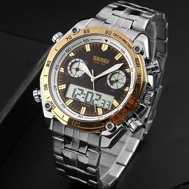 | [해외] 남성 시계 SKMEI 럭셔리 브랜드 전체 스틸 듀얼 디스플레이 쿼츠 시계 남자 패션 캐주얼 스포츠 손목 시계 relogio masculino |