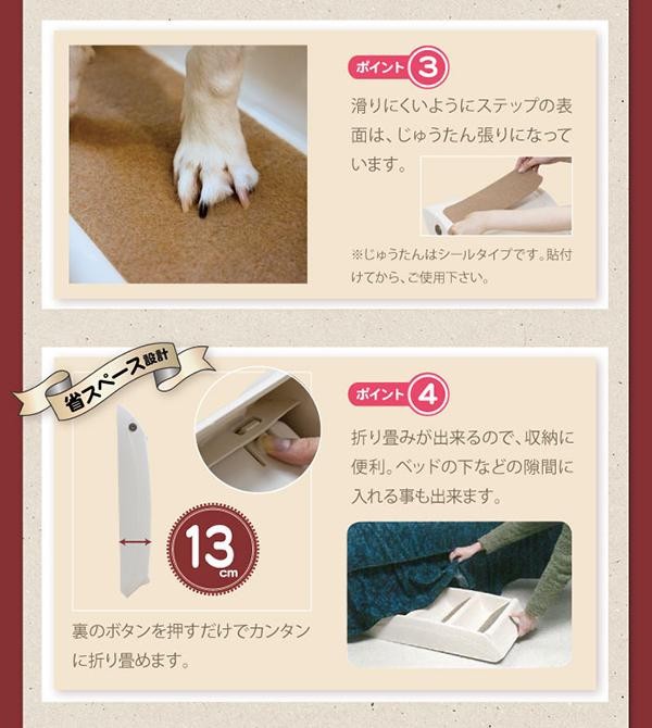 ステップ1段1段の高さが低い4段タイプですので、小さいワンちゃんや足の短いワンちゃんにオススメです。裏のボタンを押すだけでカンタンに折り畳めますので、収納にも便利です。 |