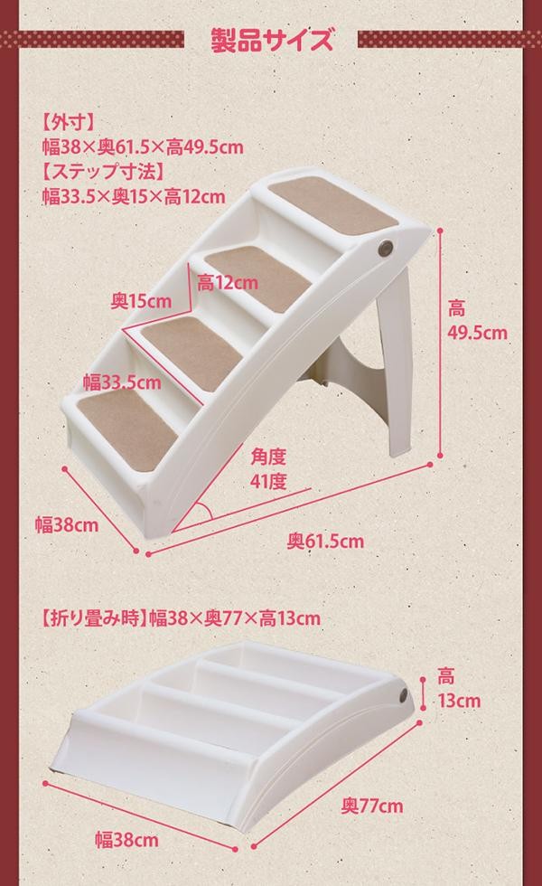 | ステップ1段1段の高さが低い4段タイプですので、小さいワンちゃんや足の短いワンちゃんにオススメです。裏のボタンを押すだけでカンタンに折り畳めますので、収納にも便利です。 |