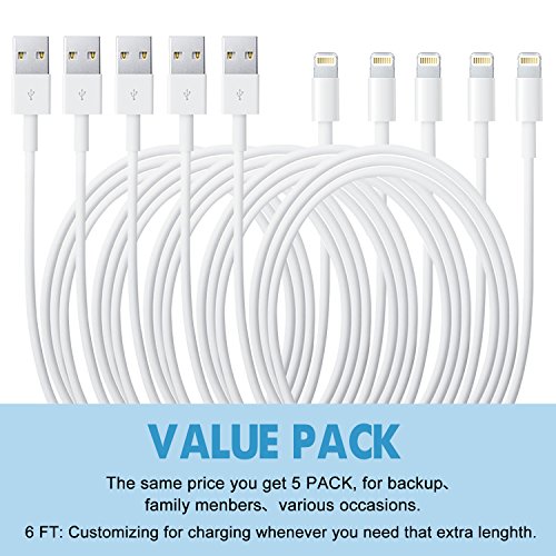 Studio : Eashion Publisher : Eashion Binding : Wireless Phone Accessory Product Description Valued Pack 5pack 6ft iphone charger meet all your needs. Premium Lightning to USB Cable Sync and charge with high speed. Ideal for Using Replace your original 3ft cable or add another for different occasions Compatibility Perfectly compatible for charging and data transfer with the entire apple family: iPhone SE iPhone 7 / 7 plus iPhone 6s plus /6s/ 6 plus /6 iPhone 5s / 5c / 5/SE iPad Air / Air 2/Pro iPad mini / mini 2 / mini 3 iPod nano (7th generation) iPod touch (5th generation) Warranty 12 Months Worry-free Product Guarantee for Every Purchase from Iconew. Package Contain 5Pack 6ft Lightning Cables in White. Notice Please ensure the power output do not exceed 2.4A/ 5V or 6V/ 3A when charged with our lightning to USB cable. 0