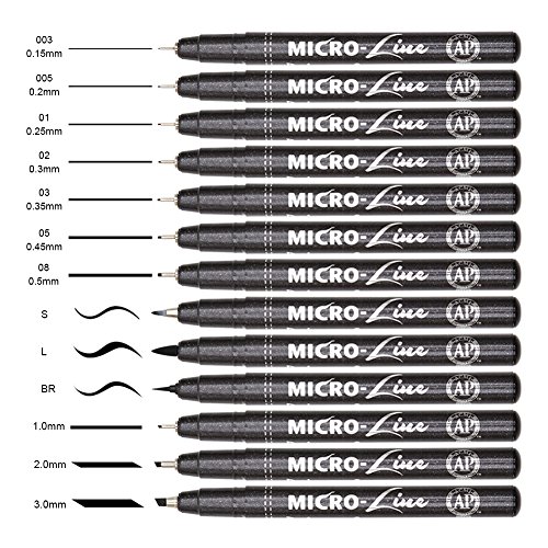 - 13 Black Micro-Pen: 003(0.15mm), 005(0.2mm), 01(0.25mm), 02(0.3mm), 03(0.35mm), 05(0.45mm), 08(0.5mm), 1.0mm, 2mm,3mm,S,L,BR
