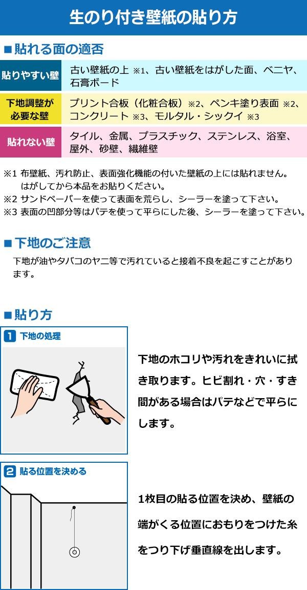 壁紙の上にそのまま貼れる生のり壁紙です。裏面に生のりを塗布しているので、保護フィルムをはがすだけで簡単に貼り始めることができます。のりが乾くまで貼り直しができるので、初心者の方にもオススメ!!壁紙のキズや破れの補修にぴったりです。 |