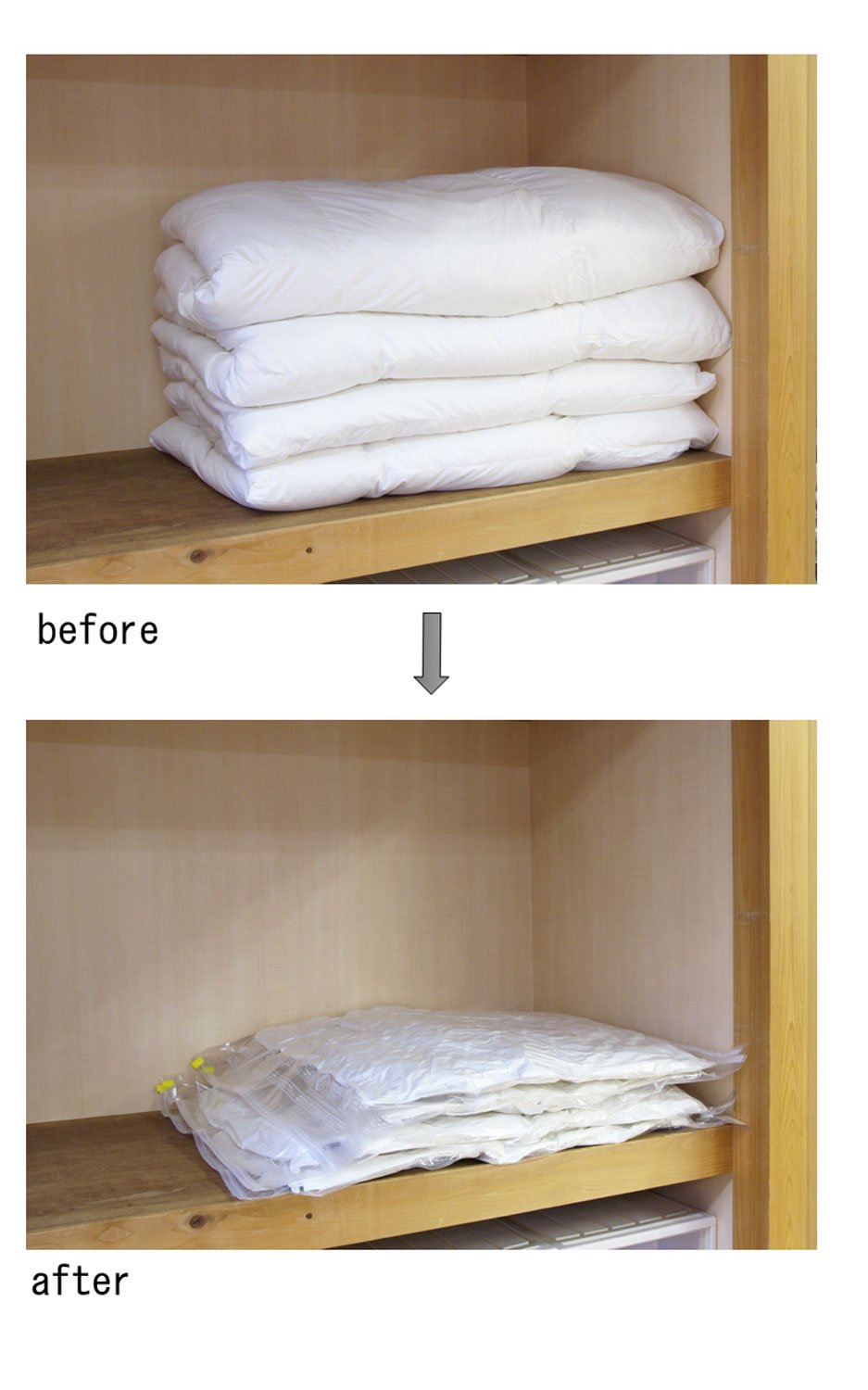 ● In case of down comforters, compression is approximately one-half of the thickness before compression.