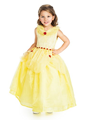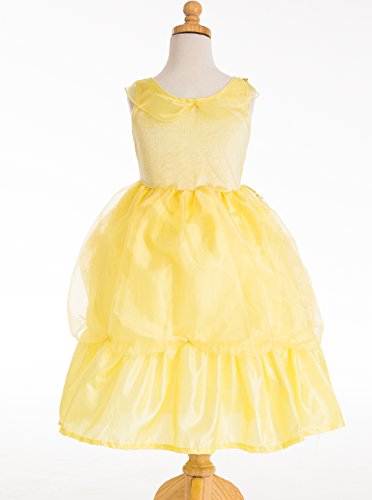 Finally, a gown worthy of such a beauty. Sparkly organza overlay, highlighted with red roses, drapes over a yellow china silk underskirt. The collar is trimmed with shimmery organza and the waist is accented with red roses. The yellow crushed velvet bodice is stretchy to accommodate most body sizes. Little Adventures is not affiliated with Disney, Beauty and the Beast, or the Belle Disney Character. Accessories Sold Separately. Available in sizes Small (1-3 Yrs), Medium (3-5 Yrs), Large (5-7 Yrs), and X-Large (7-9 Yrs).Feature