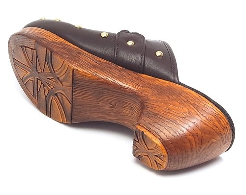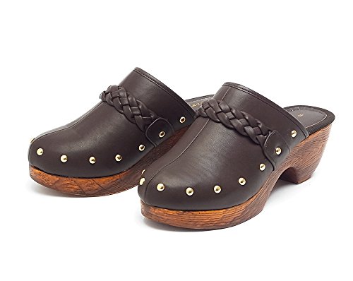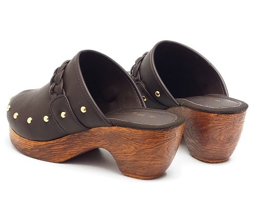 -. Title : スタッズ&編み込みベルト 厚底サボサンダル ウッド調ソール ダークブラウン