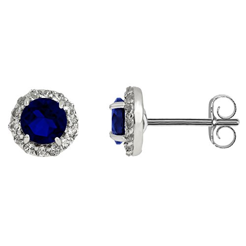 In gleaming sterling silver, these lab created sapphire stud earrings flaunt flirty faceting and a halo of white topaz accents, rendering a contemporary yet feminine look. Sapphire is a September birthstone. Perfect for Virgo and Libra