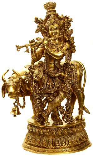 -. Binding : Kitchen -. Brand : Exotic India -. Color : Yellow -. EAN : 8903602383125 -. Feature : Made In India / Hand Crafted / Brass -. Label : Individual Artist -. Manufacturer : Individual Artist -. Model : XI43 -. MPN : XI43 -. PackageQuantity : 1 -. PartNumber : XI43 -. ProductGroup : Home -. ProductTypeName : HOME_FURNITURE_AND_DECOR -. Publisher : Individual Artist -. Studio : Individual Artist -. Title : Lord Krishna with a Cow and His Flute - Brass Sculpture