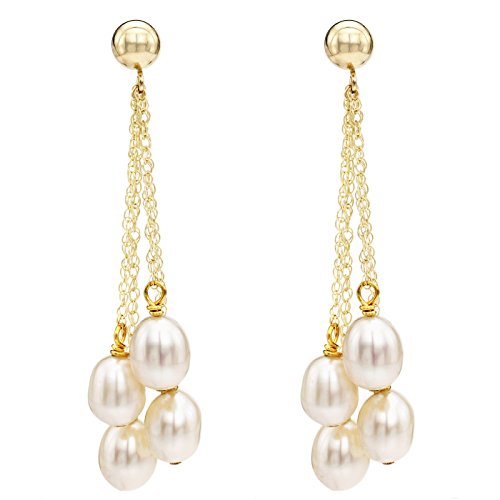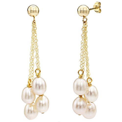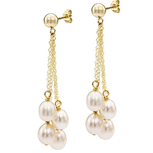 This is A Beautiful 14k Yellow Gold 4-rows 6-6.5mm White Freshwater Cultured Pearl Stud Dangle Earrings, with 0.75" - 1.4" Length Cable Chain Dangle. Secured with a Post with friction back.