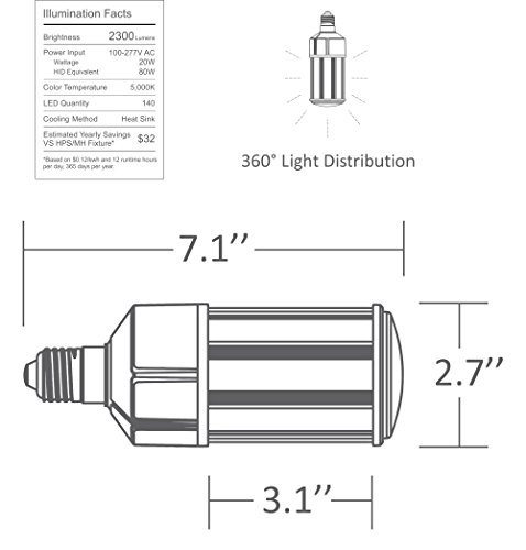 20W LED Corn Light Bulb 5000K Replaces 150W, 2,600 lumens Medium Base E26, 100-277V AC UL/cUL Certified