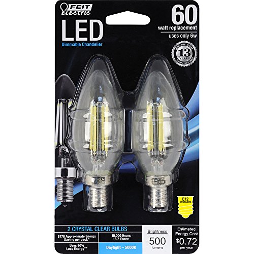 Feit Electric BPCTC60/850/LED/2 60W Equivalent Clear Daylight Dimmable Chandelier Blunt Tip Candelabra Base LED Light Bulb (2 Pack)