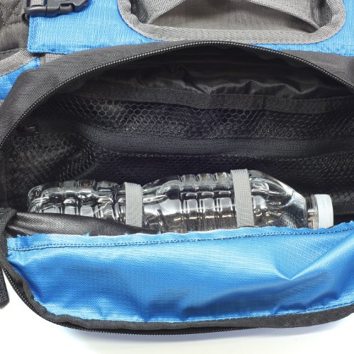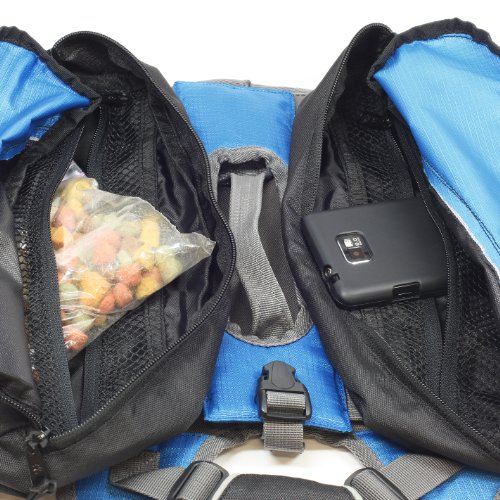 - Large pockets feature wide openings and zipper closures to carry food and water