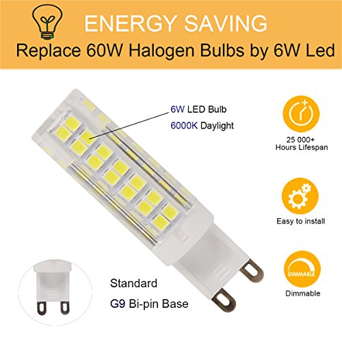 - BRIGHTNESS: 88 chips. Brighter than general LED G9. New LED G9 provide 600lm comfortable 6000k daylight white. Replace 60w halogen bulb by 6.5w LED.
