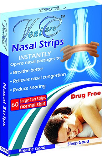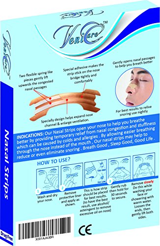 VeniCare Nasal Strips Designed to fit all adult noses , These tan, Drug-Free nasal strips are specially designed to help reduce snoring and relieve nasal congestion due to cold or allergies and help you breath with ease during such conditions. VeniCare Nasal Strips?are 50% stronger Than regular nasal strips in the market to improve your airflow Certificates : CE FDA?Approved (OTC) Over The Counter Use Features: 1- Two flexible "spring-like" pieces gently lift upwards the congested nasal passages so you can breathe through your nose, close your mouth and stop snoring, allowing you and your partner to get a good night's rest. 2- Special adhesive holds the strip comfortably in place. 3- Improves airflow by 31%. 4-You can wear these strips while sleeping or during exercise. The strips have special adhesive that holds them comfortably. ?Cautions for nasal patch: 1. To get maximum effective results, place strip in the correct position on a clean, dry nose. 2. For single use only. Do not use for more than 12 hours. 3. Not for children under 5 years old 4. Do not use over sores, sunburned or irritated skin. 5. If rash or skin irritation occurs, discontinue use. 0 |